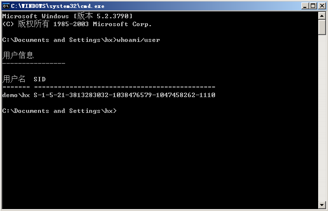 登录普通域用户hx,cmd中输入"whoami/user"获取sid