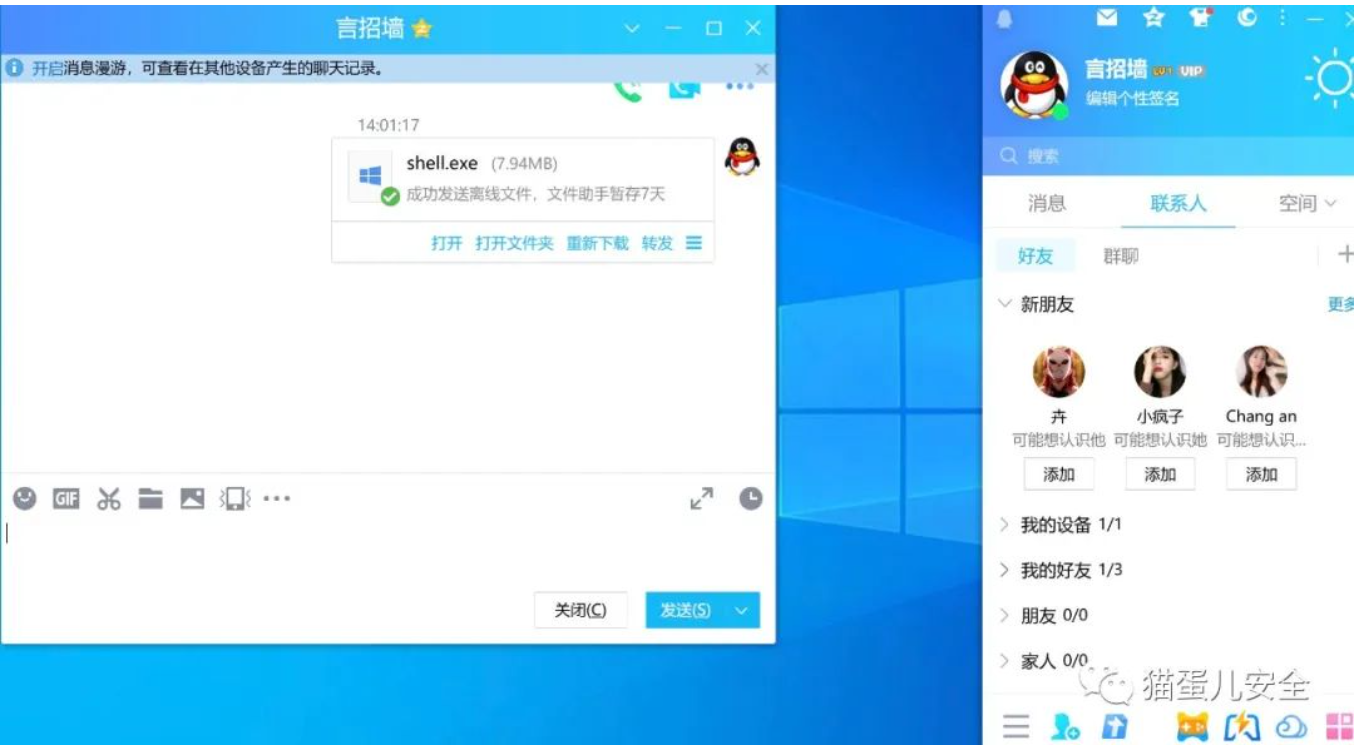 2023年8月20日,赛博昆仑捕获到利用QQ桌面客户端远程执行的漏洞,该漏洞为逻辑漏洞,攻击者可以利用该漏洞在QQ客户端上进行无需用户确认文件下载执行为,当用户点击消息链接时,QQ客户端会自动下载并打开文件,最终实现远程代码执行的目的。建议谨慎点击任何消息链接。