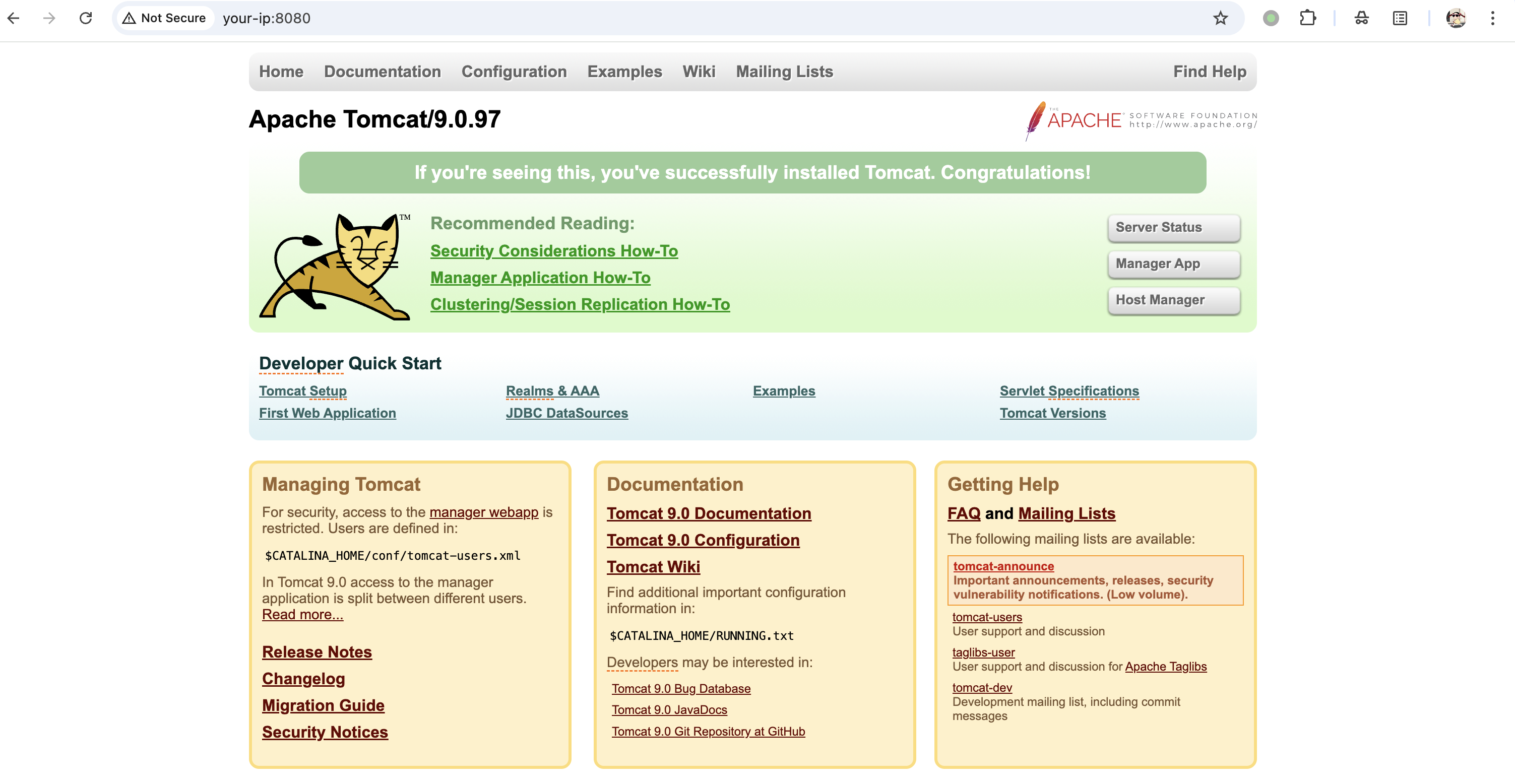 服务启动后,访问 `http://your-ip:8080` 即可看到 Tomcat 的示例页面。