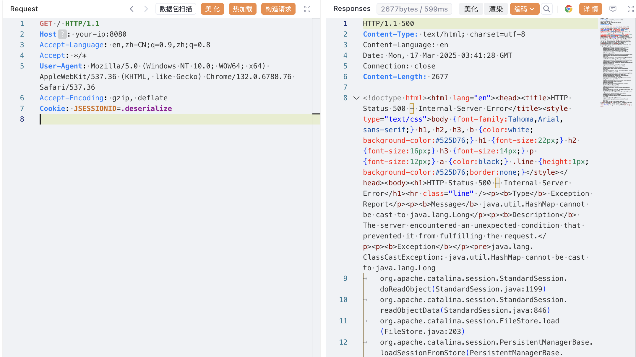 然后,发送另一个带有 JSESSIONID cookie 的请求,触发文件 `.deserialize.session` 的反序列化:
