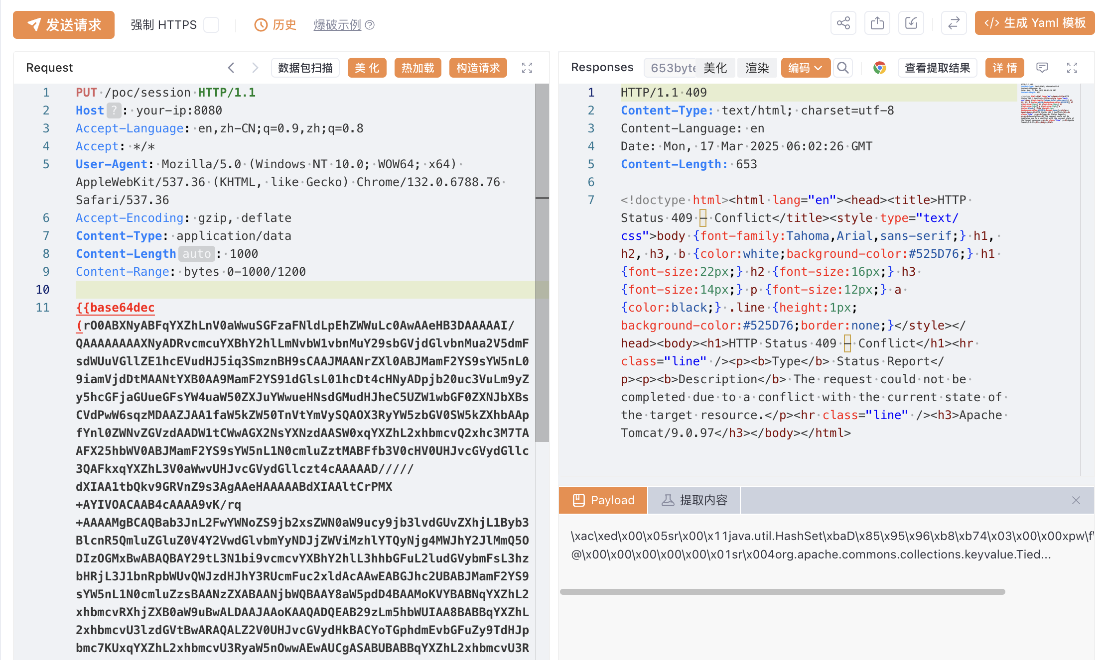 发送带有 Content-Range 头的部分 PUT 请求,在临时目录 `$CATALINA_BASE/work/Catalina/localhost/ROOT` 中写入名为 `.poc.session` 的文件: