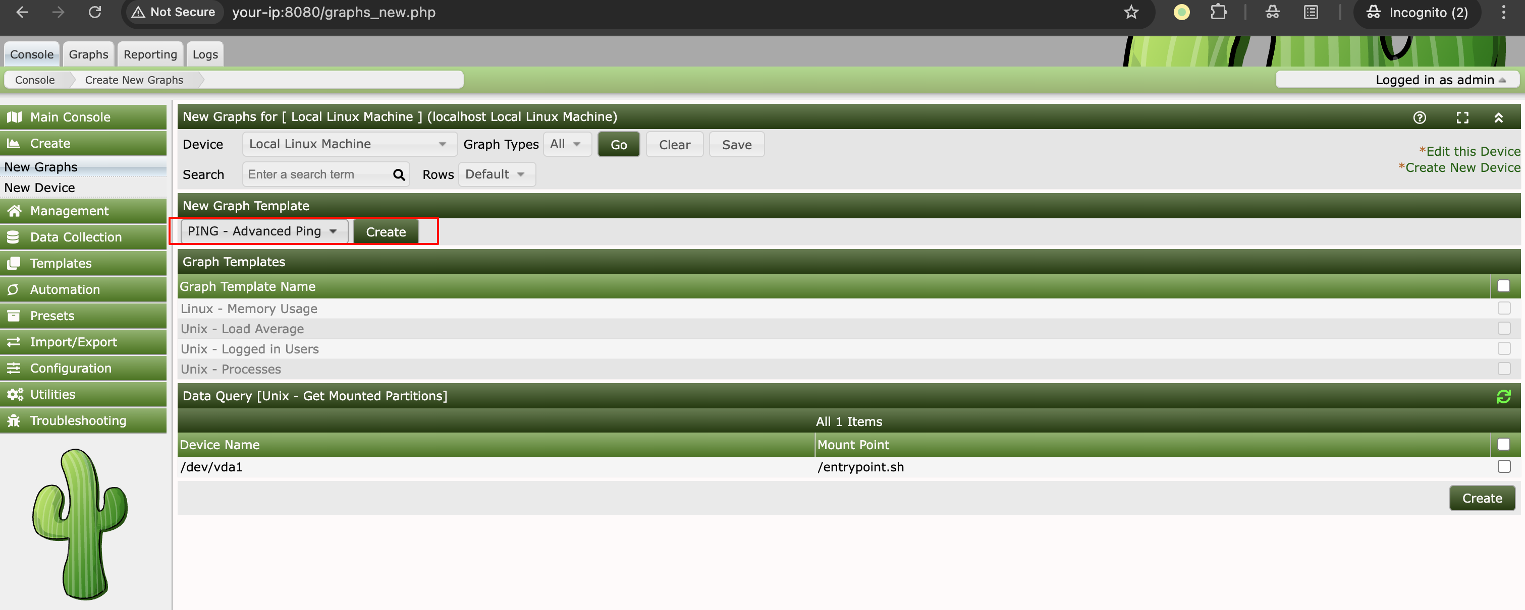 然后,来到 "Console → Create → New Graphs",使用 "PING - Advanced Ping" 模板创建一个新图表: