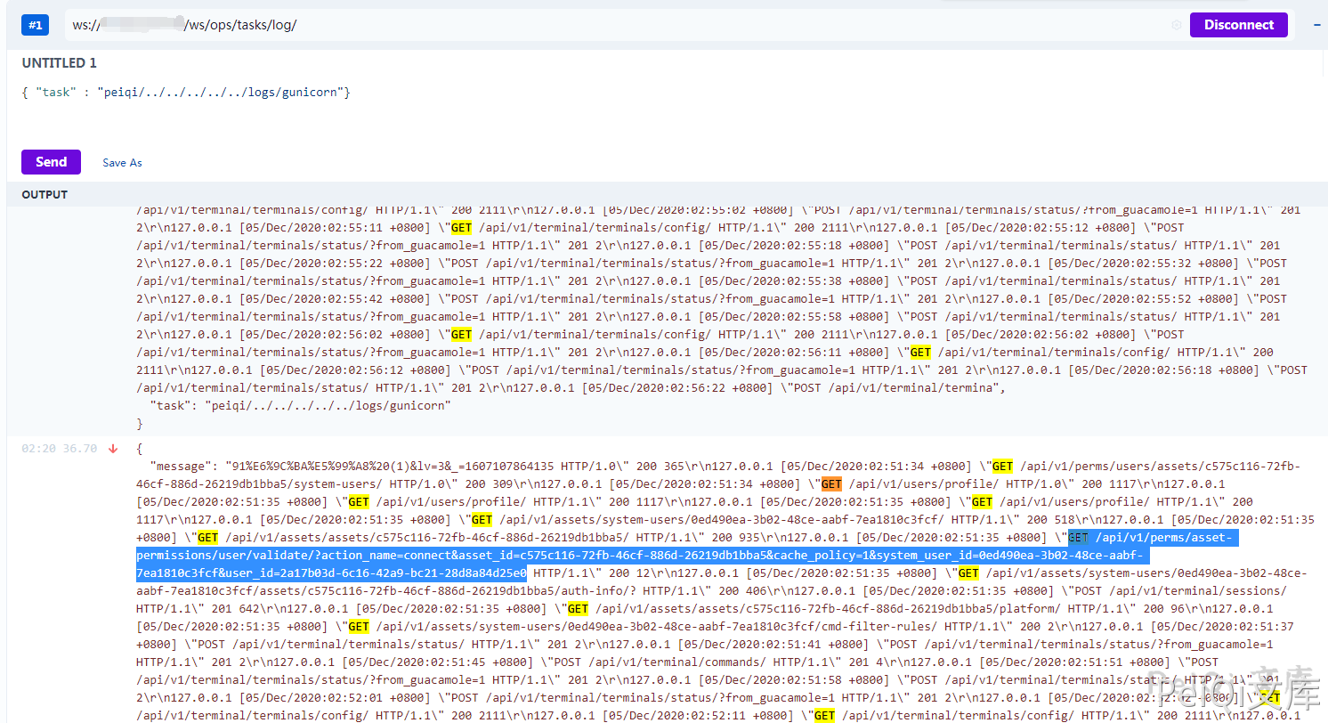 新版对用户进行了一个判断,可以使用 谷歌插件 WebSocket King 连接上这个websocket 进行日志读取