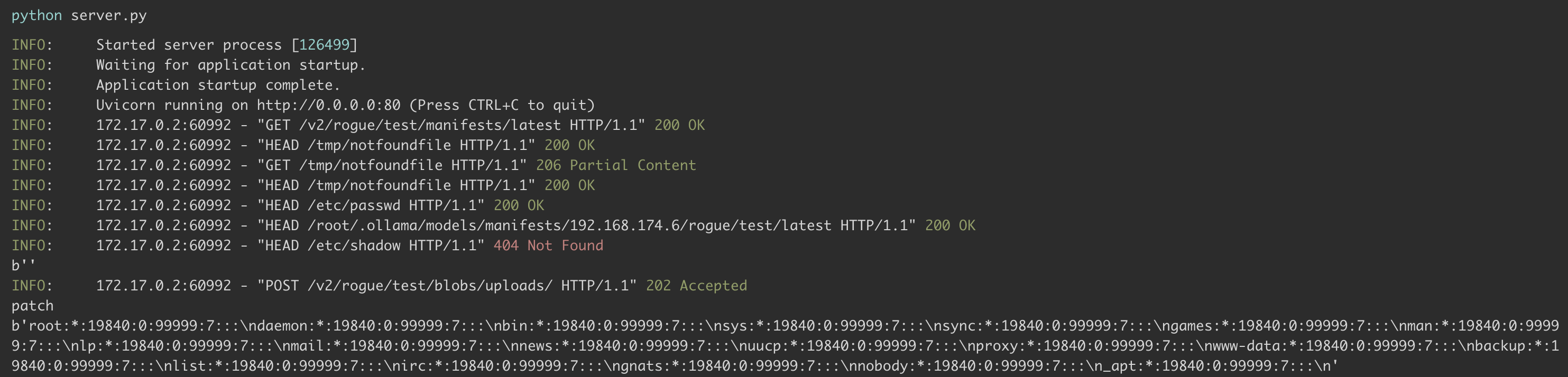 但是,模型文件存储到文件系统时未对 digest 字段进行校验,如果在该字段中构造一个 payload,将会导致服务器在处理 manifest 时读取并泄露 digest 字段指定的文件内容,通过该漏洞,攻击者可读取任意文件。