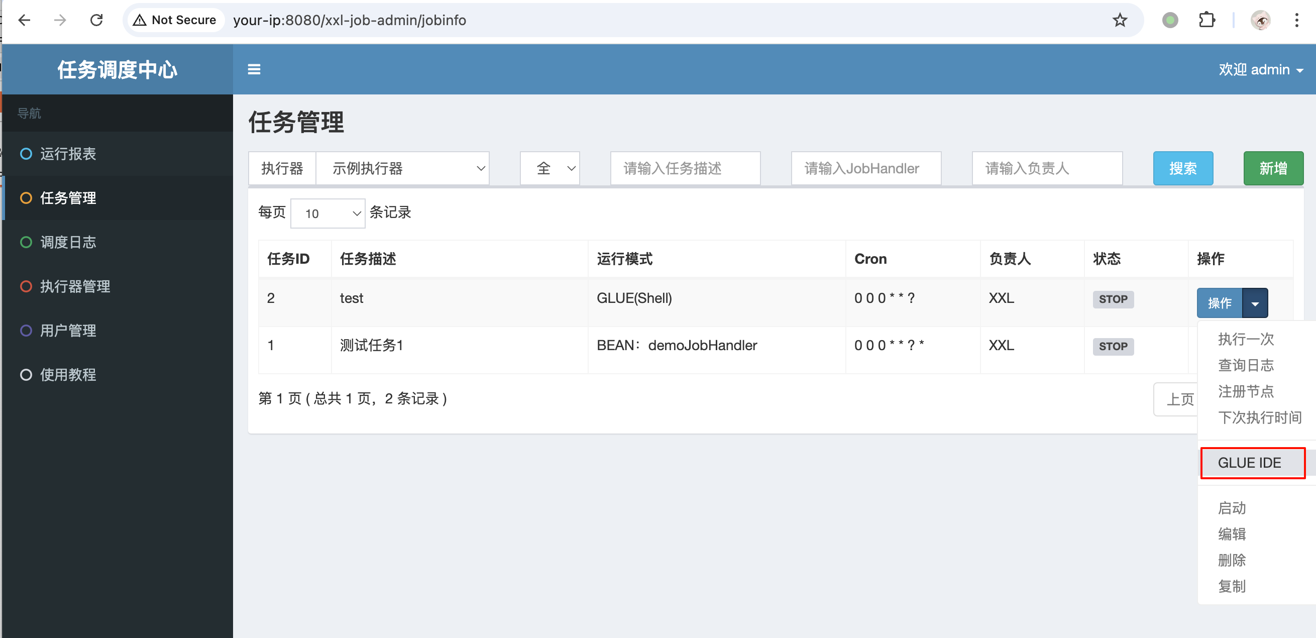 弱口令 admin/123456 登录后台,新增一个 GLUE 模式任务: