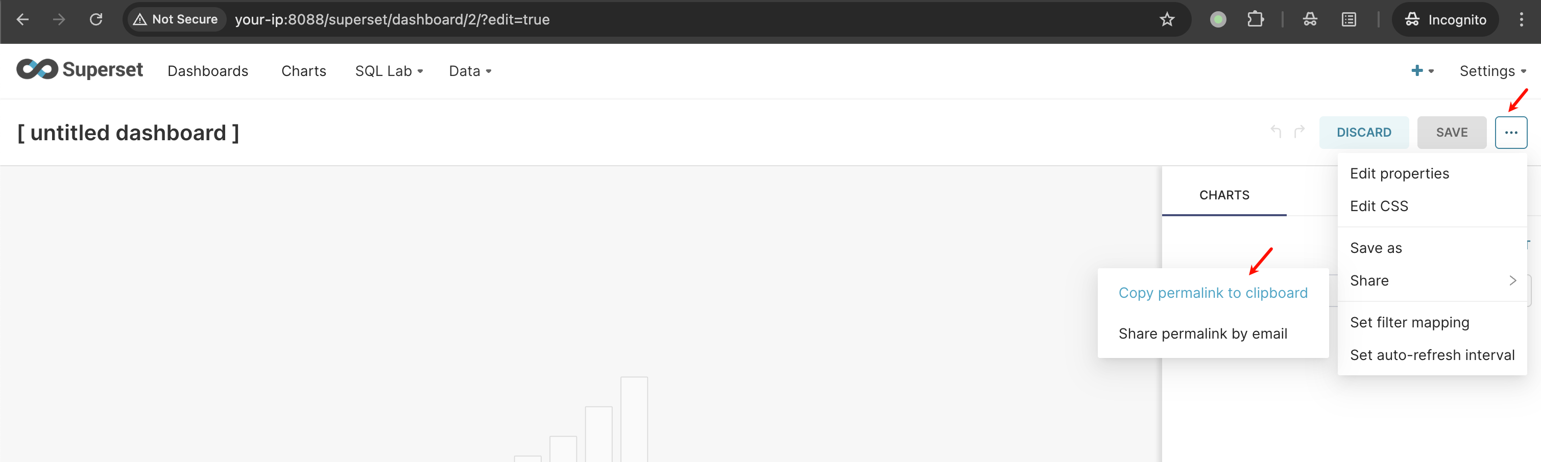 首先,创建一个新的 "Dashboard",并通过点击 "Share" 按钮生成一个永久链接,复制这个永久链接,稍后将会用到: