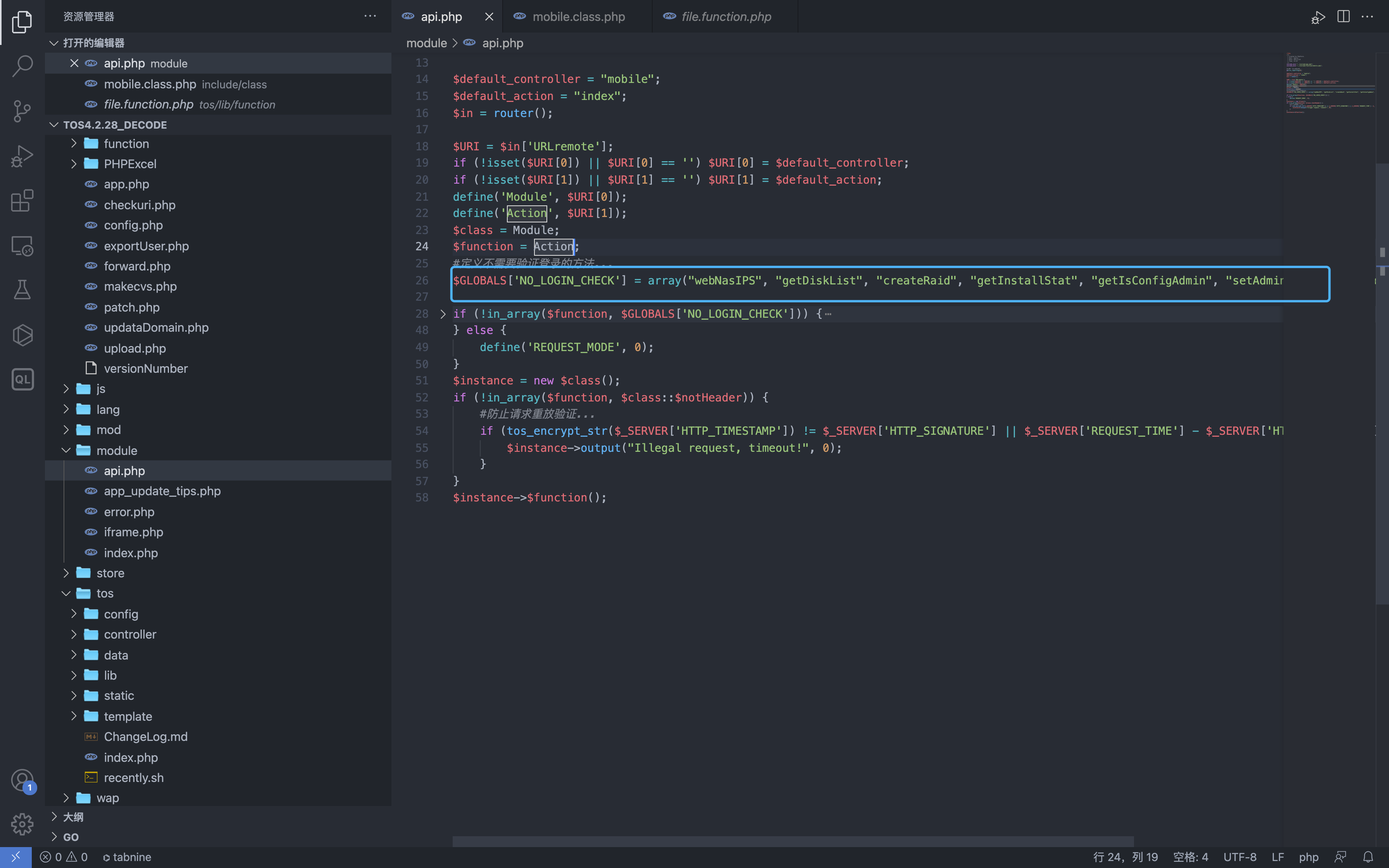 第一个判断了调用的方法名称是否在$notHeader数组中,它会测试用户代理 http 标头是否为 'TNAS' 并且 AUTHORIZATION 标头是否等于$this->REQUESTCODE。否则它会退出并显示错误消息