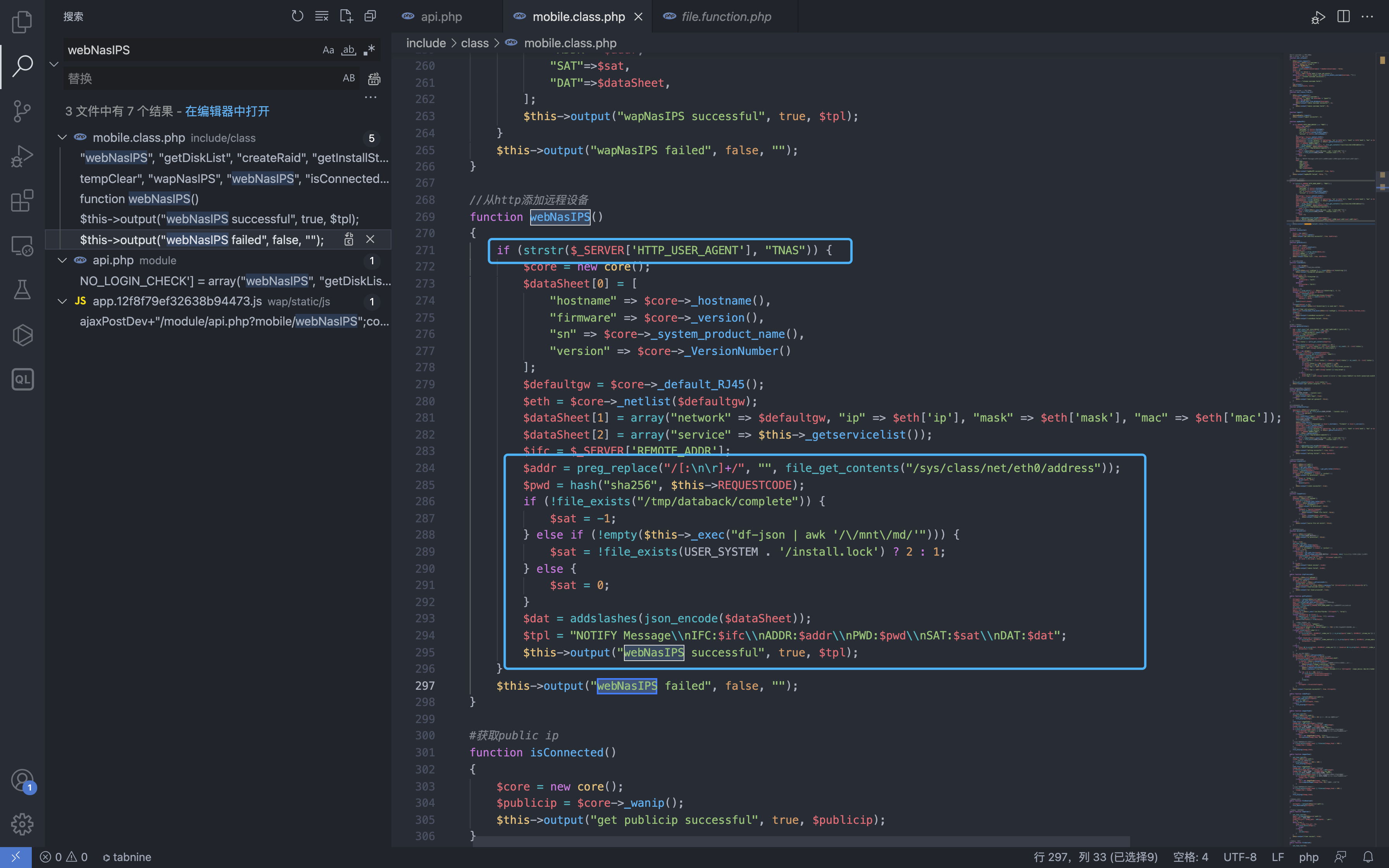 可以发现这个方法的调用只需要添加 User-Agent: TNAS, 我们就可以调用这个方法来获取服务器中敏感信息