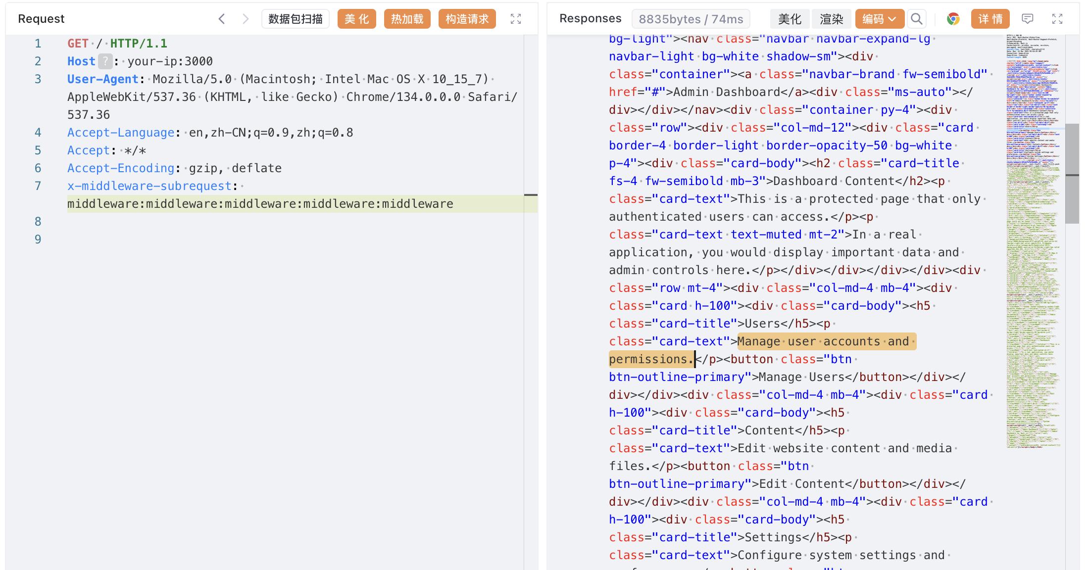 要利用此漏洞,可以在请求中添加 x-middleware-subrequest 请求头,其值为 middleware:middleware:middleware:middleware:middleware。Next.js 中间件会错误地处理此请求头并绕过身份验证检查: