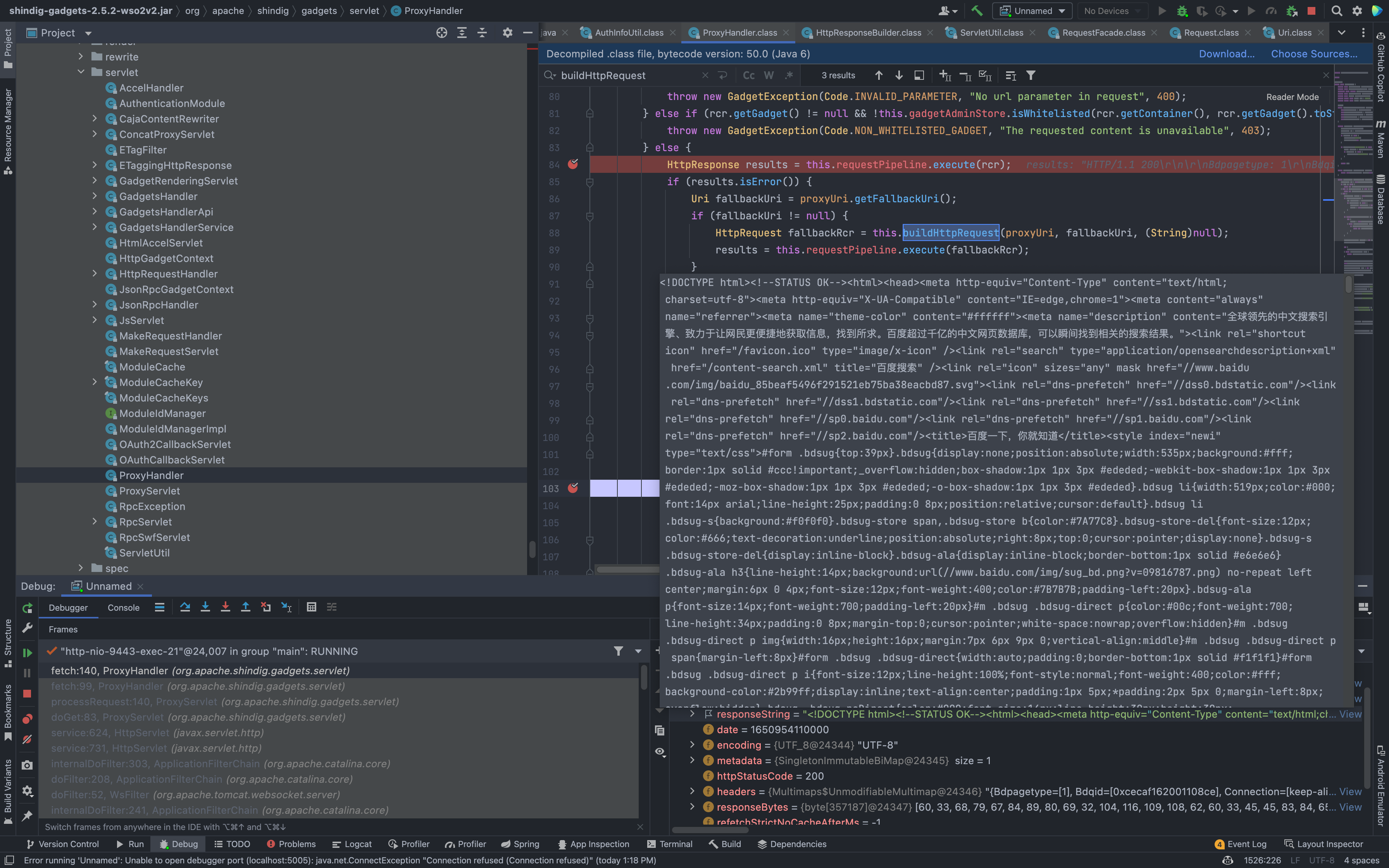 可以看到当访问此路径时,调用了对应的 Servlet 下的 doGet方法 来处理(org.apache.shindig.gadgets.servlet.JsServlet.doGet(JsServlet.java:86)