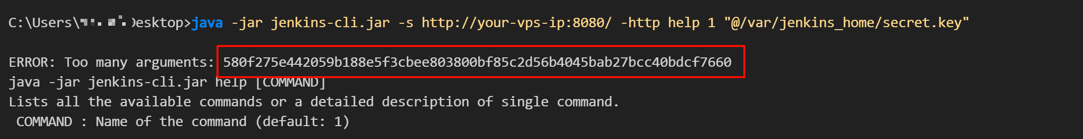 java -jar jenkins-cli.jar -s http://your-vps-ip:8080/ -http help 1 "@/var/jenkins_home/secrets/master.key"