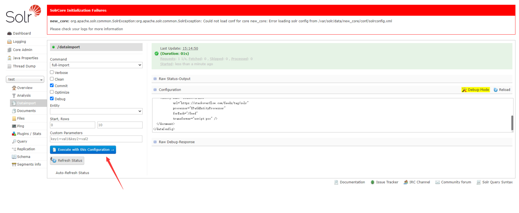 2019 年 08 月 01 日,Apache Solr 官方发布预警,Apache Solr DataImport 功能 在开启 Debug 模式时,可以接收来自请求的”dataConfig”参数,这个参数的功能与data-config.xml 一样,不过是在开启 Debug 模式时方便通过此参数进行调试,并且 Debug 模式的开启是通过参数传入的。在 dataConfig 参数中可以包含 script 恶意脚本导致远程代码执行。