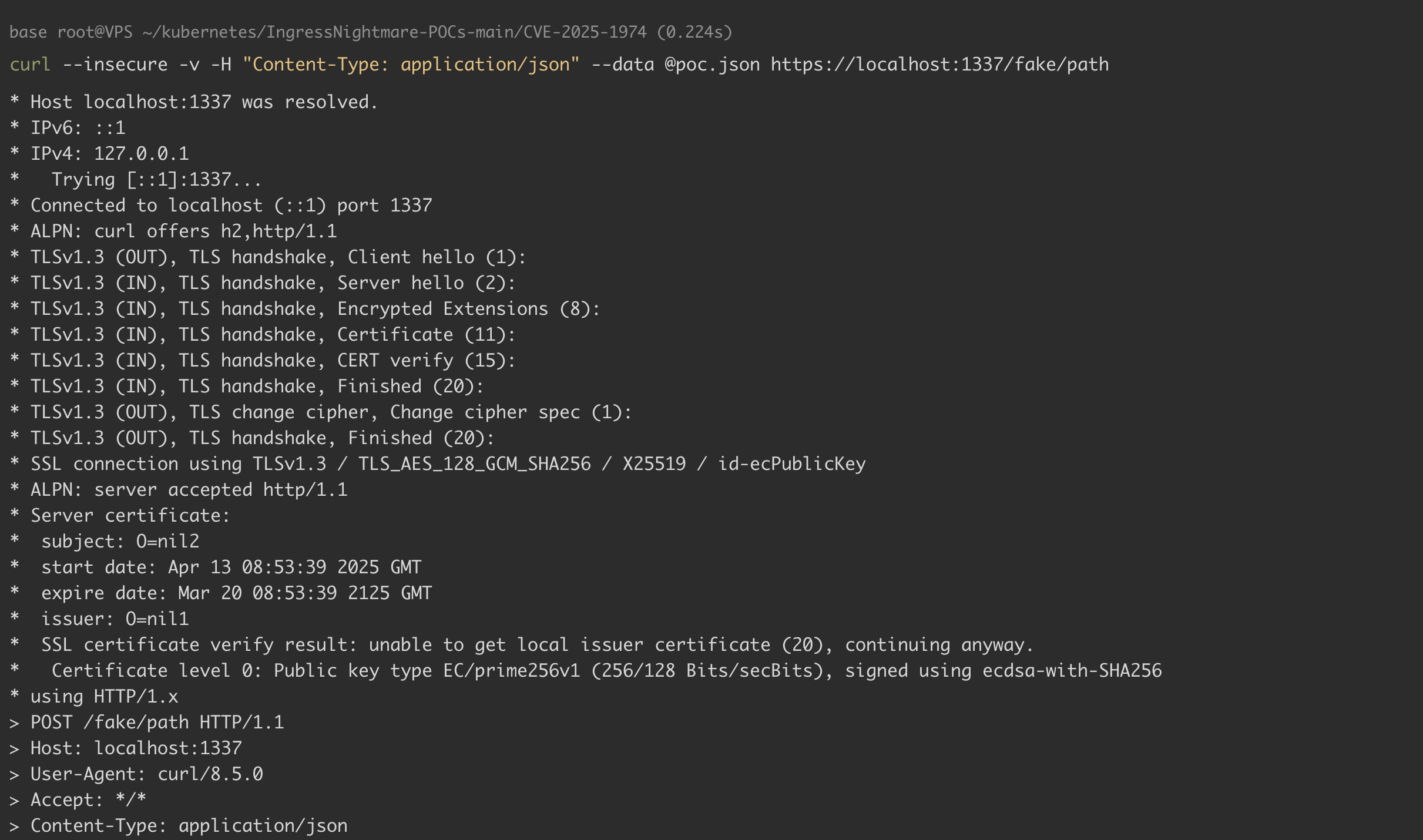 curl --insecure -v -H "Content-Type: application/json" --data @poc.json https://localhost:1337/fake/path