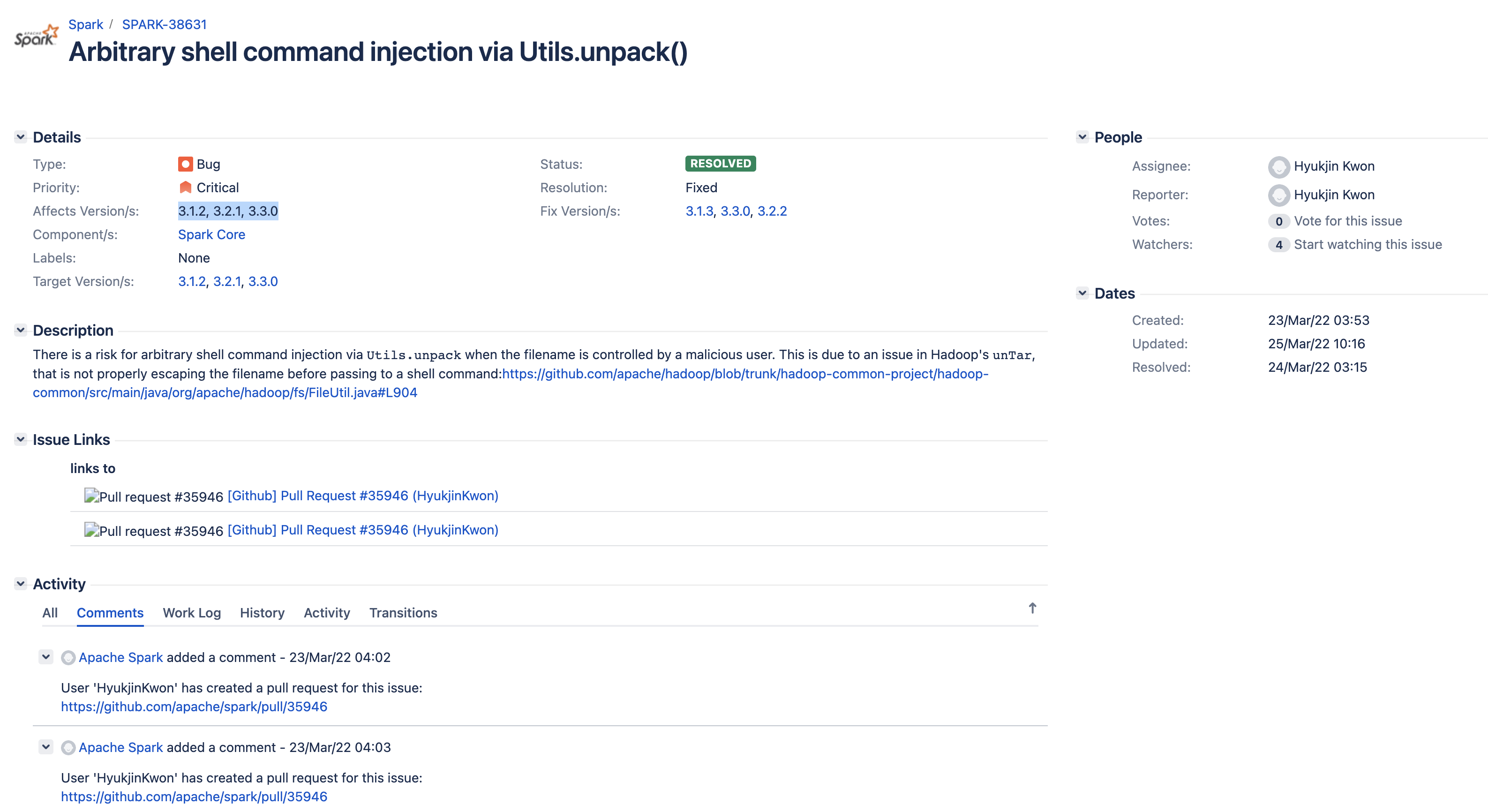 Apache Spark unTarUsingTar 命令注入漏洞 SPARK-38631