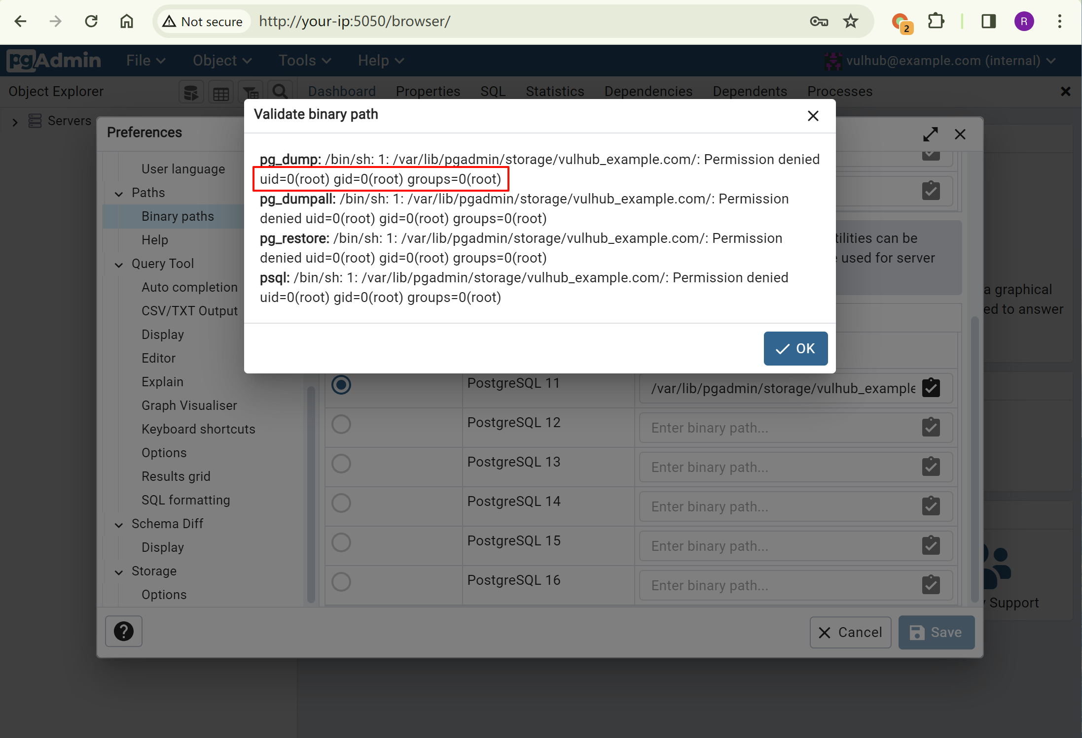 选择“File -> Preferences”打开设置页面,并来到“Paths -> Binary paths”面板。在任意一个“PostgreSQL Binary Path”文本框中填入/var/lib/pgadmin/storage/vulhub_example.com/";id;#,并点击右侧的“验证”按钮: