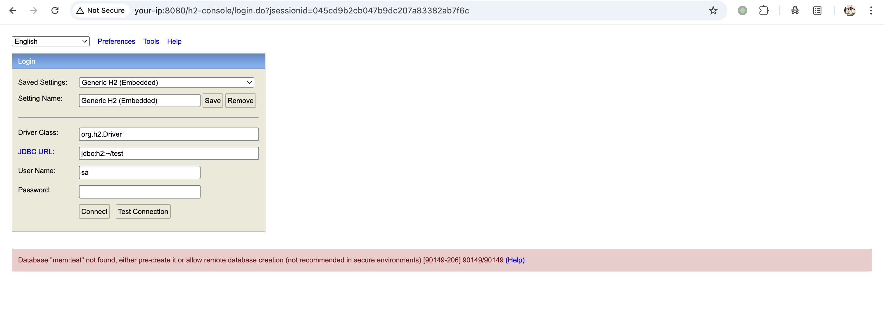 在复现本漏洞前,可以先确认 CVE-2018-10054 中的 payload 已无法利用,因为 1.4.198 版本及以后,内存数据库被禁用,报错 Database “mem:test” not found, either pre-create it or allow remote database creation (not recommended in secure environments):