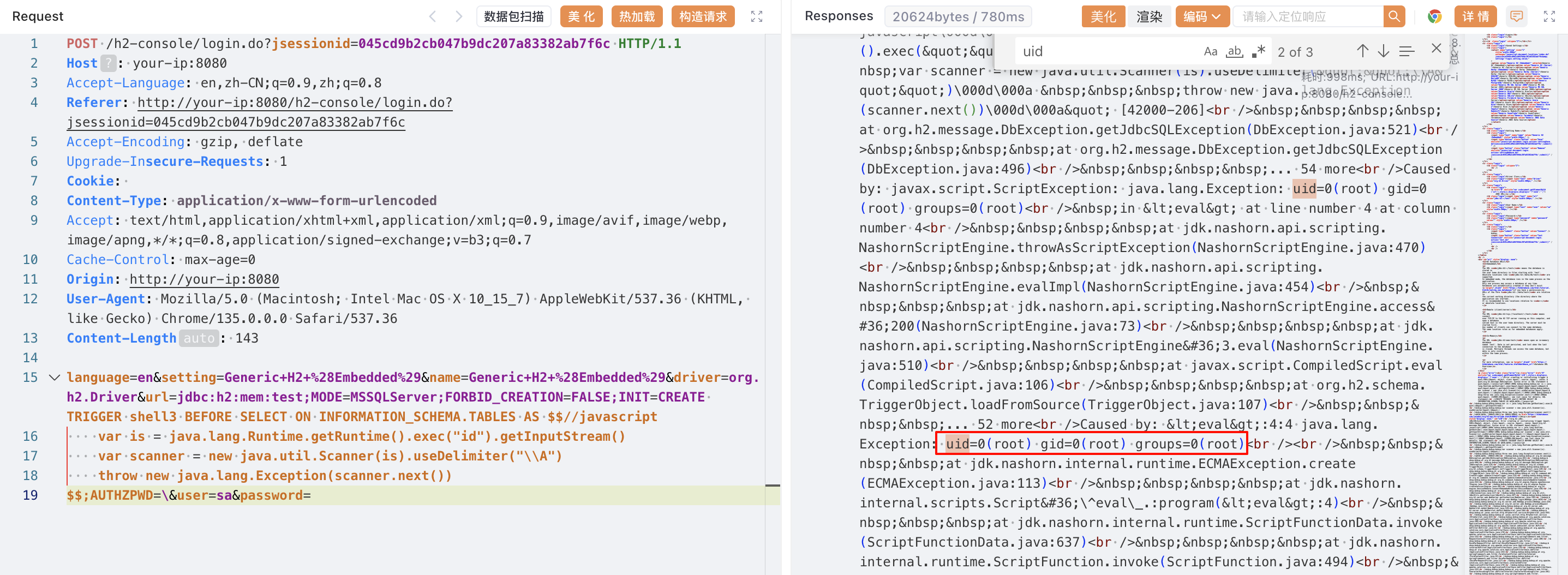 jdbc:h2:mem:test;MODE=MSSQLServer;FORBID_CREATION=FALSE;INIT=CREATE TRIGGER shell3 BEFORE SELECT ON INFORMATION_SCHEMA.TABLES AS $$//javascript