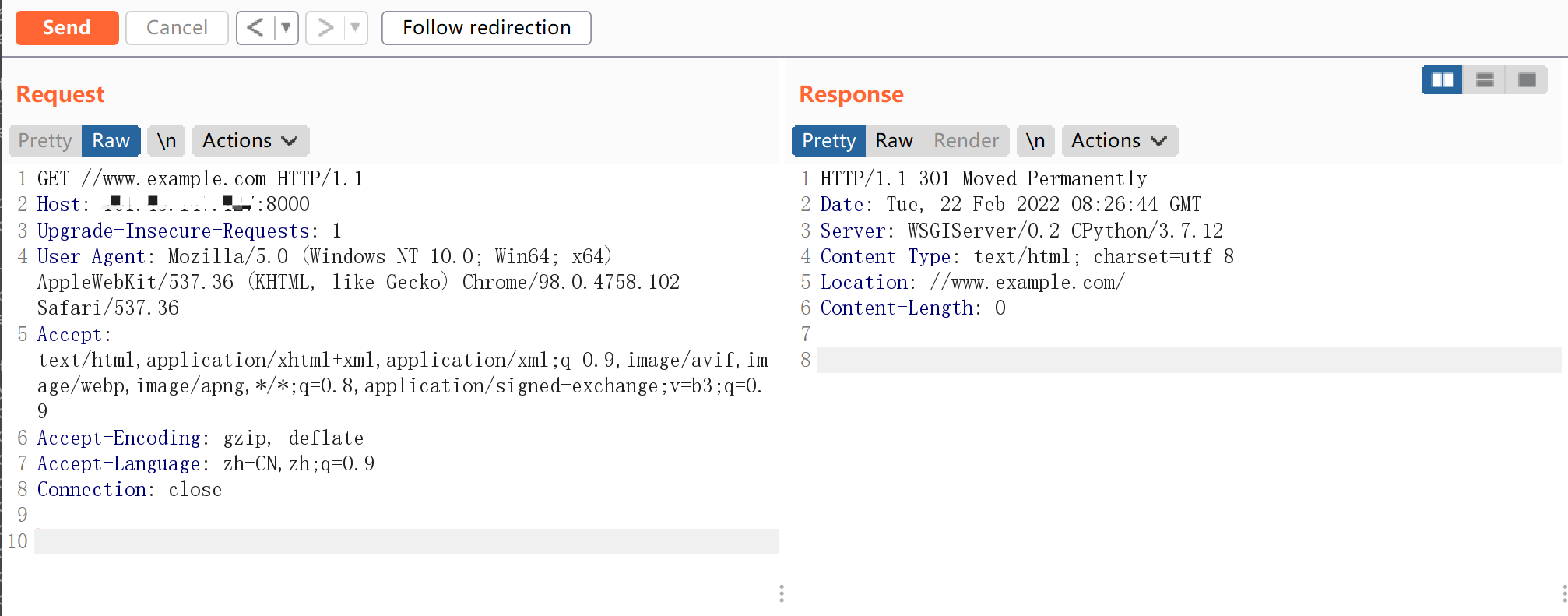 访问 http://your-ip:8000//www.example.com,即可返回是 301 跳转到 //www.example.com/:
