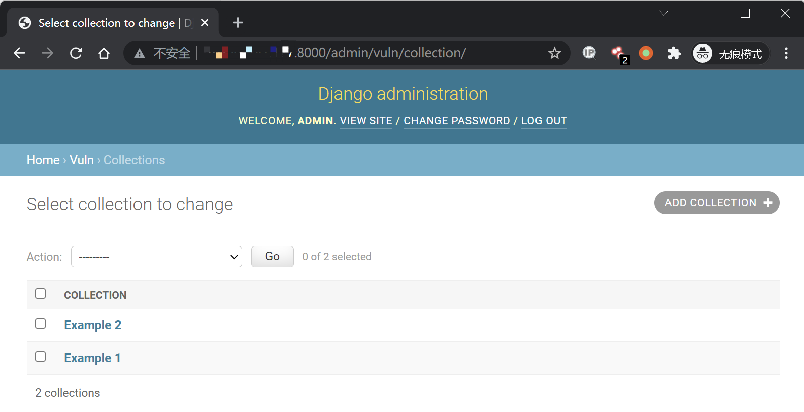 登陆后台后,进入模型 Collection 的管理页面 http://your-ip:8000/admin/vuln/collection/: