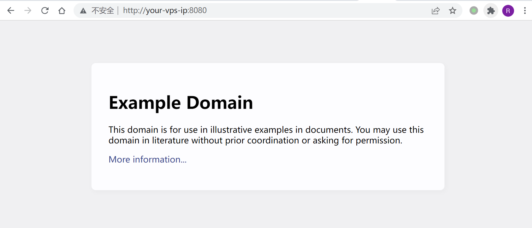 服务启动后,访问 http://your-ip:8080 即可看到演示页面,这个页面的上游就是 example.com。