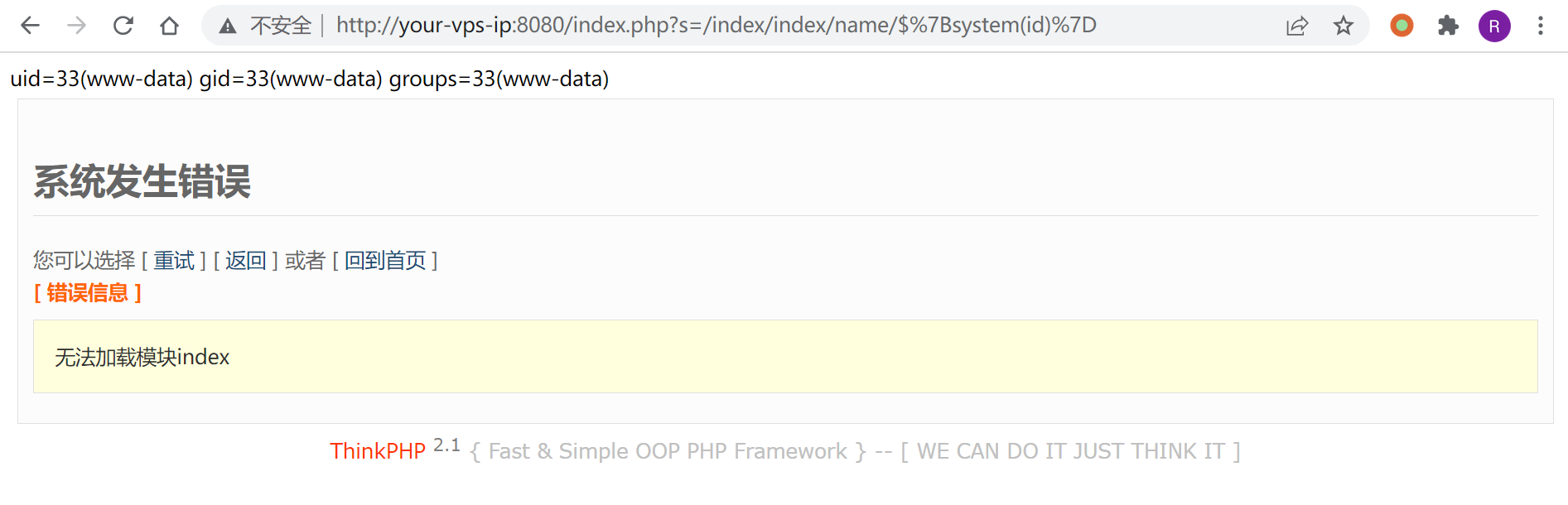 http://your-ip:8080/index.php?s=/index/index/name/$%7Bsystem(id)%7D