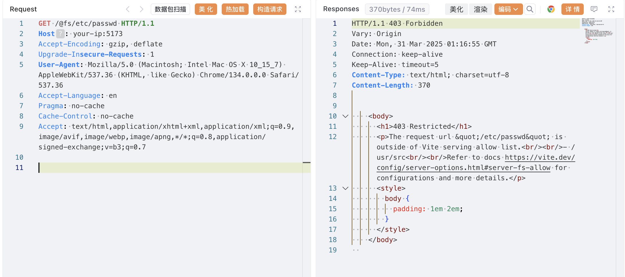 可见,当发送请求到 http://your-ip:5173/@fs/etc/passwd 时,你会收到 403 Forbidden 响应,因为这个路径在 Vite 服务的允许范围之外。