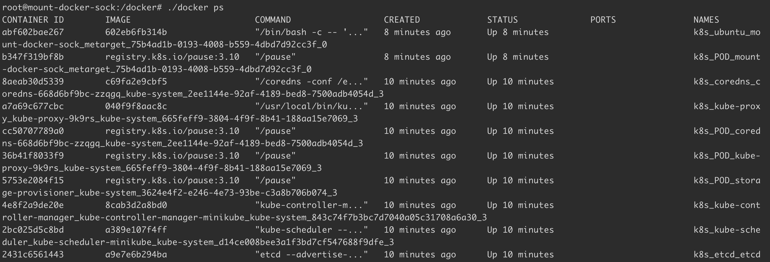 b347f319bf8b registry.k8s.io/pause:3.10 "/pause" 8 minutes ago Up 8 minutes k8s_POD_mount-docker-sock_metarget_75b4ad1b-0193-4008-b559-4dbd7d92cc3f_0