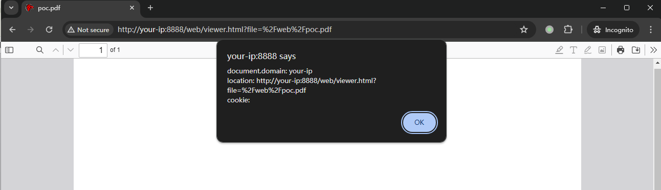 上传恶意PDF文件poc.pdf,即可触发XSS弹窗。