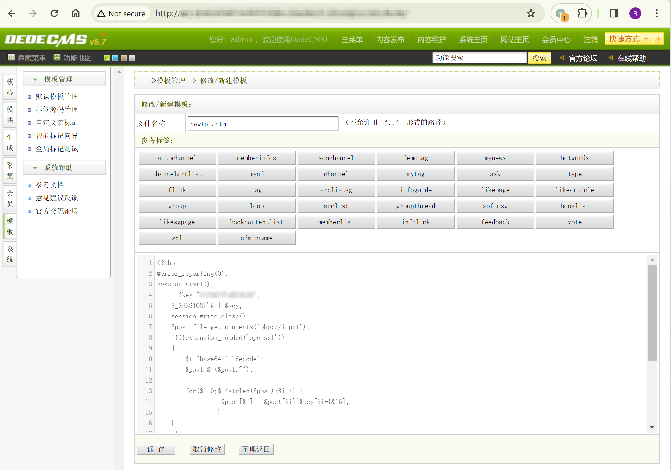 模板 -> 默认模板管理 -> 新建模板,写入shell,保存: