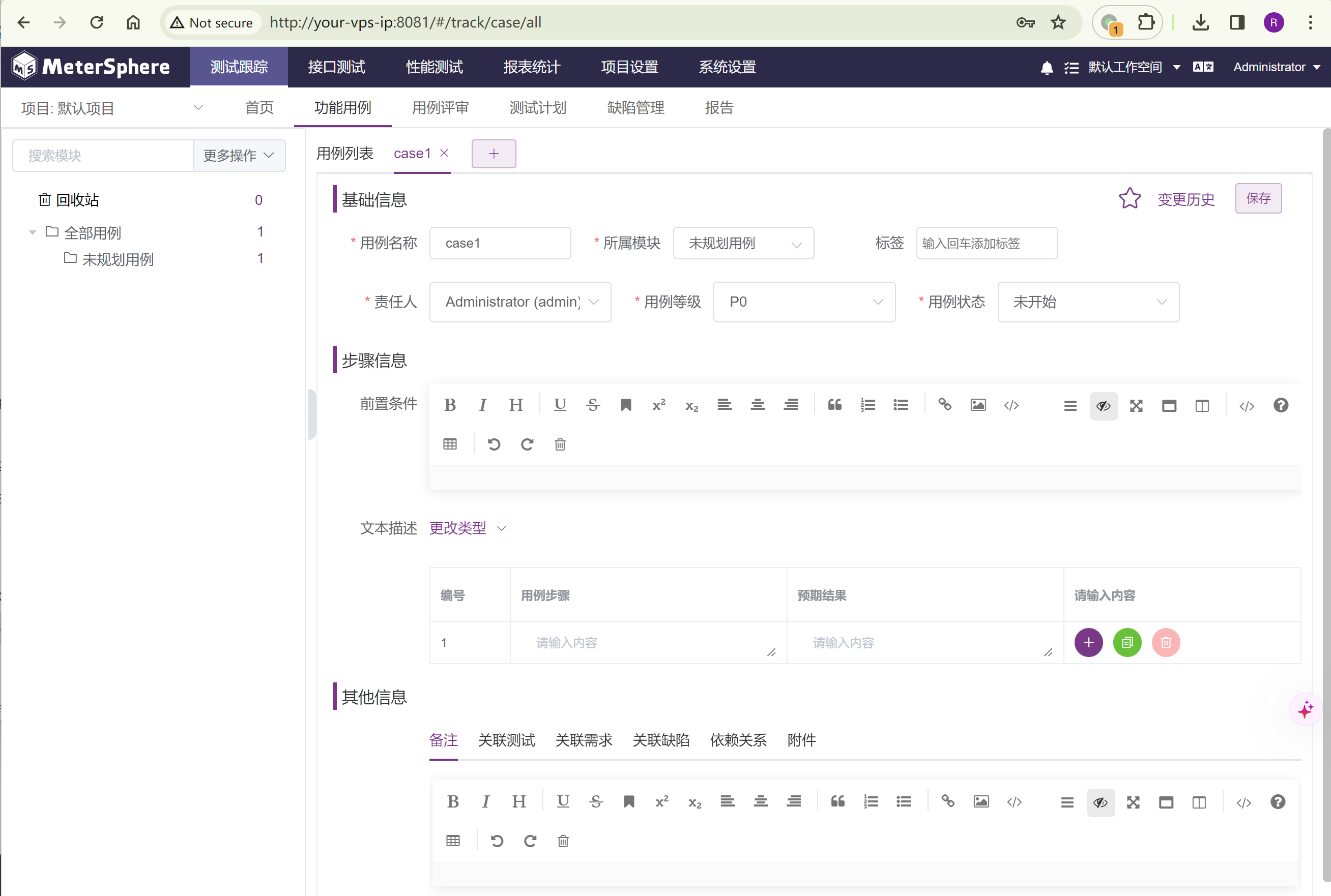 使用账号admin和密码metersphere来登录用户界面。在http://your-vps-ip:8081/#/track/case/all创建一个新的测试用例: