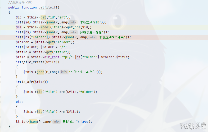 出现漏洞的函数在文件 framework/admin/tpl_control.php 中的 delfile_f() 函数