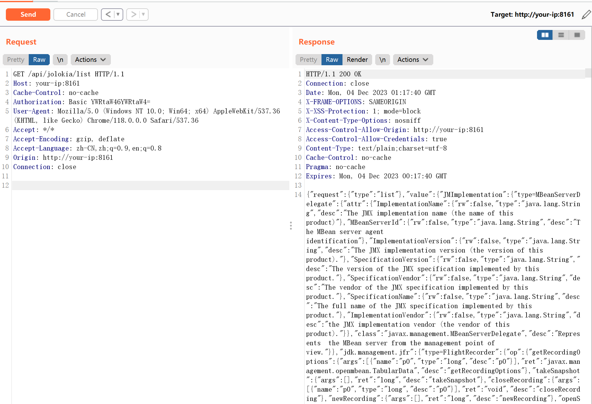 首先,访问/api/jolokia/list这个API可以查看当前服务器里所有的MBeans(请求头需要添加 Origin,否则返回 403 Forbidden):