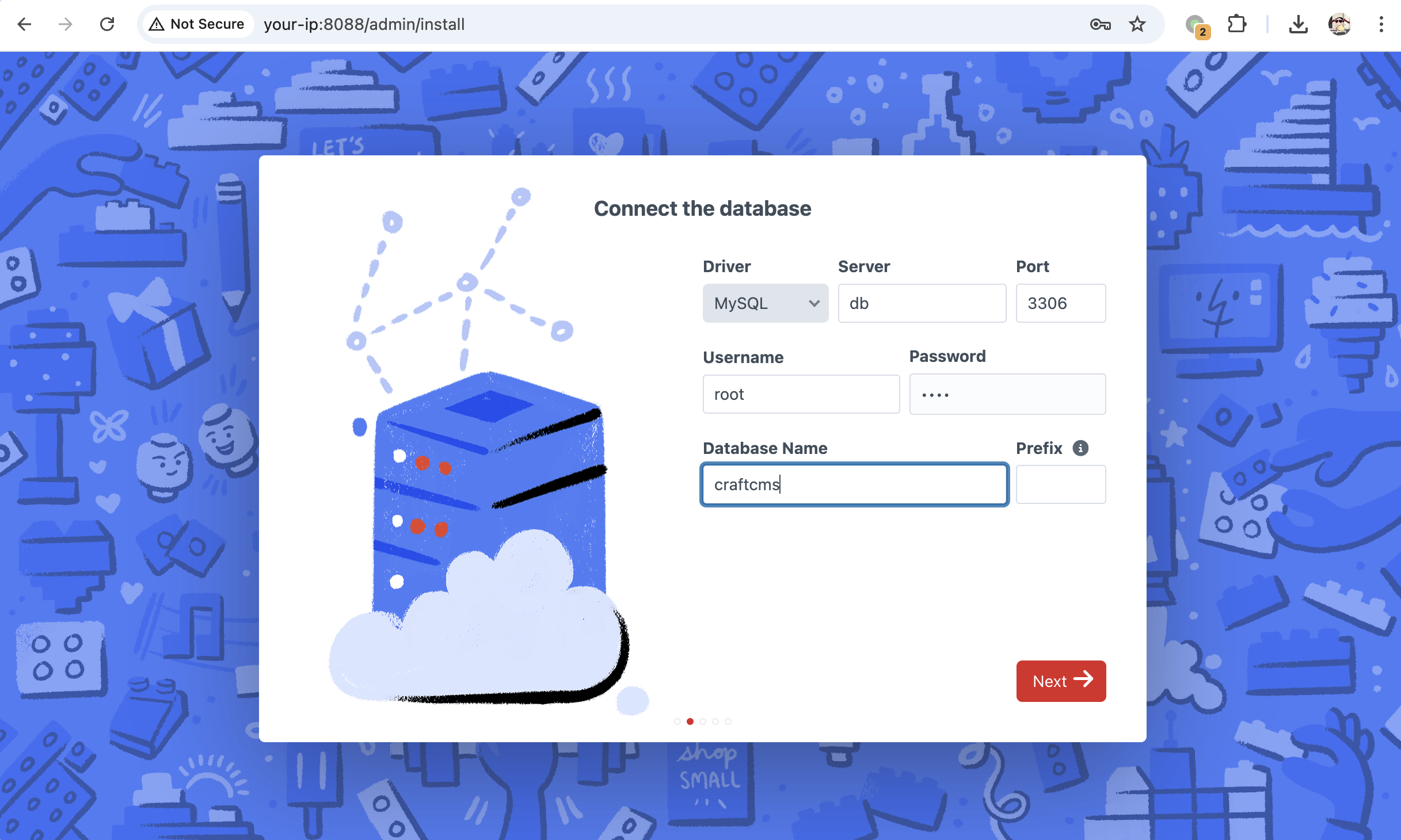 服务器启动后,你可以在 http://<your-ip>:8088/admin/install 看到安装页面。请按照说明安装 CraftCMS,默认数据库地址为 db,用户名和密码均为 root。