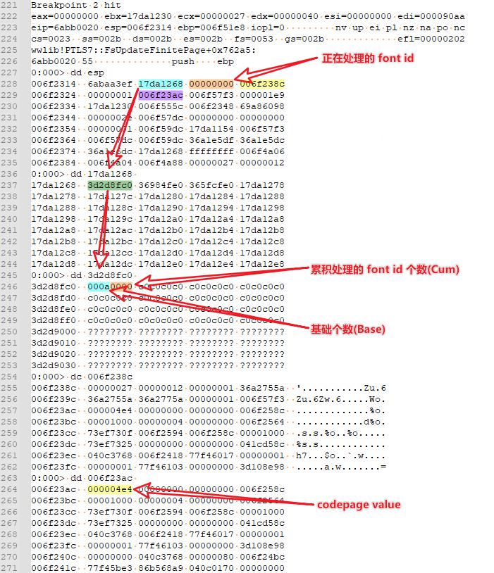 存储 fond id 和 codepage value 的代码片段同时也是 crash 时的上下文。