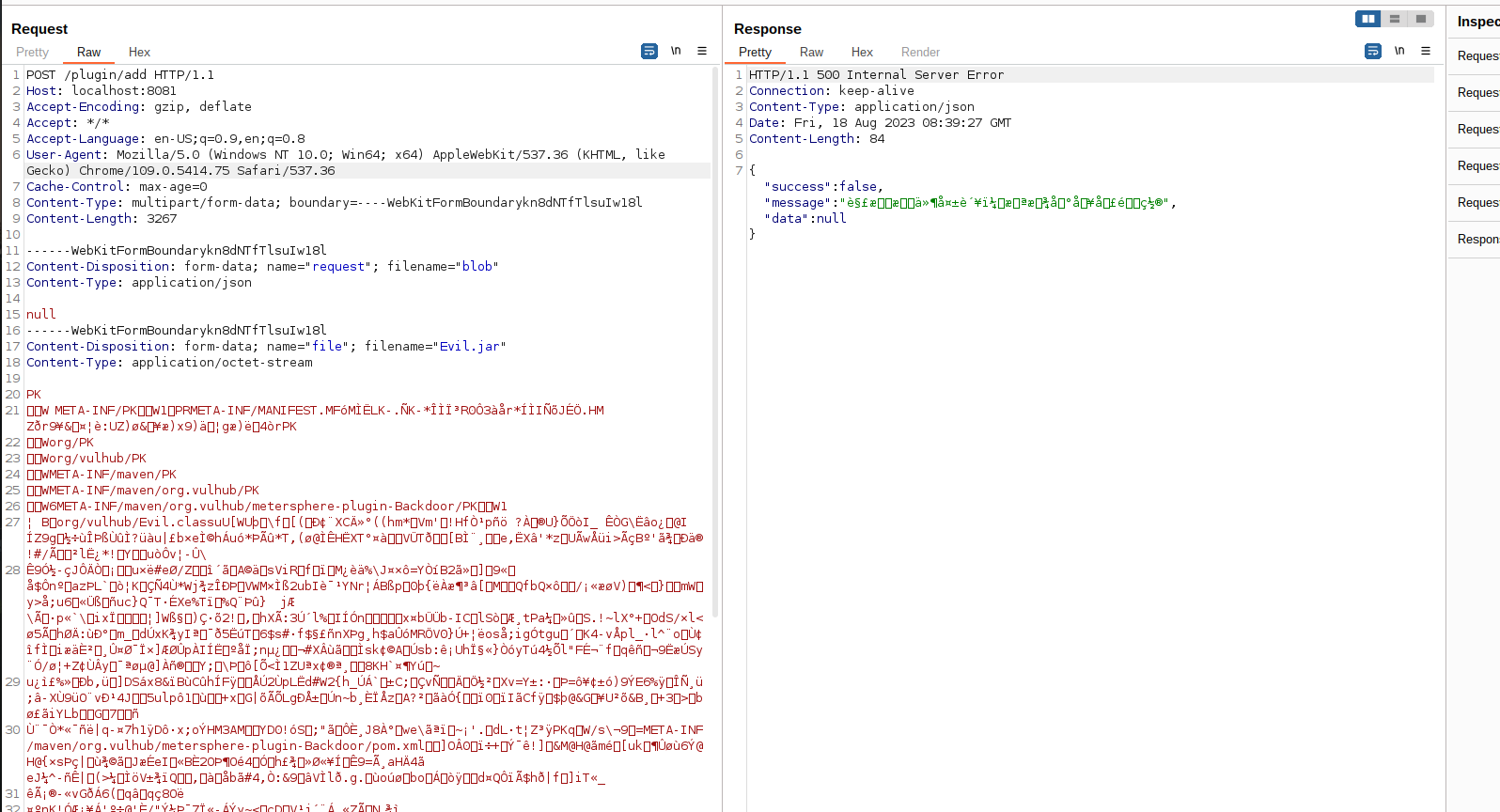 虽然这次上传会返回错误信息,但实际上恶意JAR包已经成功被添加进系统ClassLoader中。